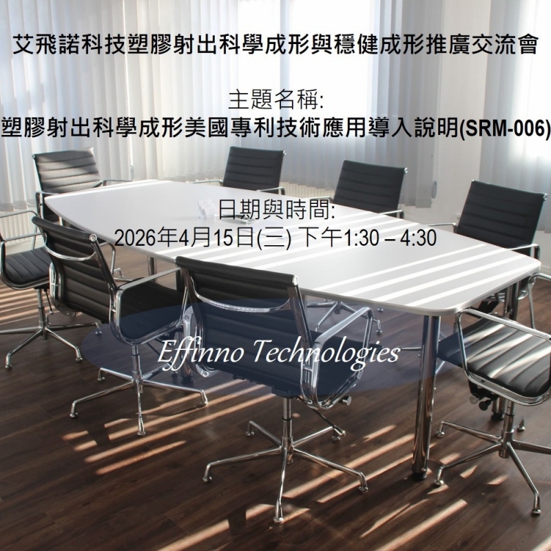 主題名稱: 塑膠射出科學成形美國專利技術應用導入說明(SRM-006) 活動日期與時間: 2026/4/15(三) 13:30-16:30,共3小時